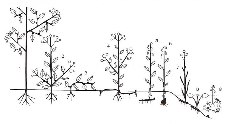 Foto:  De verschillende levensvormen van Raunkiær. 1= Fanerofyt; 2-3= Chamaefyt; 4= Hemikryptofyt; 5-6= Geofyt; 7= Helofyt; 8-9= Hydrofyt.