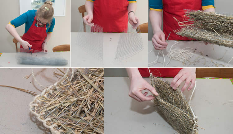 Elk stuk plooi je in twee. De gesloten zijde wordt de bovenkant van het mandje. - Vul beide stukken kippengaas met hooi of zeegras. Geen al te dik pak aanbrengen.