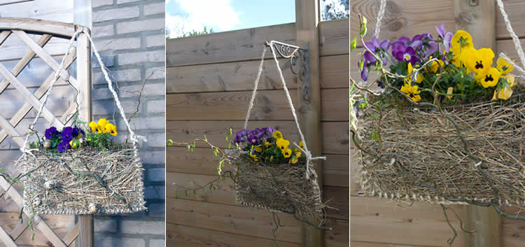 Een leuk en origineel hangmandje met viooltjes voor in de tuin. Makkelijk zelf te maken met kippengaas en hooi of mos.