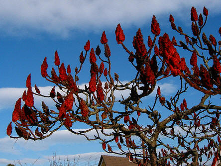 De bij ons geplante fluweelboom - Rhus typhina wordt ca. 7,5 m hoog. Mannelijke en vrouwelijke bloemen zitten op afzonderlijke bomen. De vrouwelijke vormen een dichte, donsachtige, geelgroene, kaarsachtige bloemtuilen, 10 tot 20 cm lang, de mannelijke grotere ijlere pluimen. De bladeren zijn geveerd en getand. De vruchten staan in bundels. Ze zijn bordeauxrood en fluweelachtig. De bladeren zijn bedekt met zacht, fluweelachtig haar. In het najaar verkleuren zij tot helder oranje. Samen met de karmozijnrode vruchten leveren zij een bijzonder schouwspel in elke tuin.