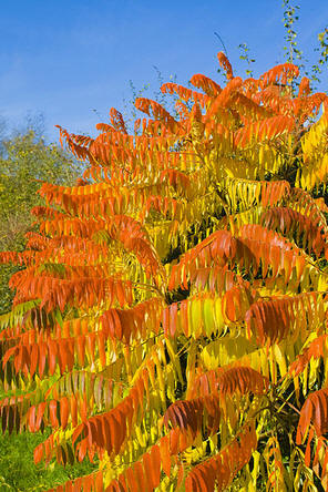 Het blad van Rhus typhina ‘Dissecta’ is varenachtig. Hij behoudt zin tuilen tot diep in de winter.