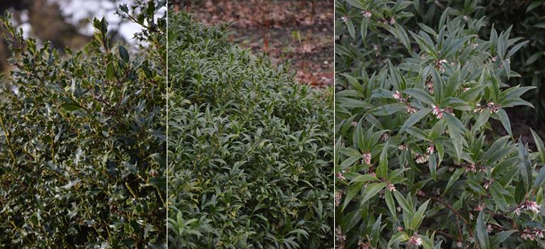 Groenblijvende wolken en andere organische vormen zorgen in de donkerste maanden voor veel dynamiek in de tuin. Met maar één accent, bijvoorbeeld tegen het huis of als onderbreking in de border, heb je al veel effect. Struikkamperfoelie (Lonicera nitida) is een krachtige groeier die zich daar goed toe leent. Het blad gelijkt wat op buxus maar de plant is veel minder ziekte- en plagengevoelig en groeit sneller. Laat de eerste jaren vrij groeien, tot de struiken ongeveer de hoogte hebben bereikt die je voor ogen hebt, en begin dan pas met ze in vorm te snoeien. Liever geen gesnoei? Er zijn genoeg groenblijvende struiken met een mooie natuurlijke vorm zoals Japanse hulst (Ilex crenata) of groenblijvende bamboe (Fargesia) die niet woekert. Struikklimop (Hedera helix ‘Arborescens’) klimt niet over de grond of tegen muren maar vormt een mooie bolle struik met trosjes zwarte winterbessen: ideaal voor een plek met wat meer schaduw. Of plant een vleesbes (Sarcococca). Dit compact ministruikje met glimmende blaadjes geeft heerlijk zoetgeurende witte bloemen van januari tot maart en is een prachtplant voor een (stads)tuintje met niet veel zon.