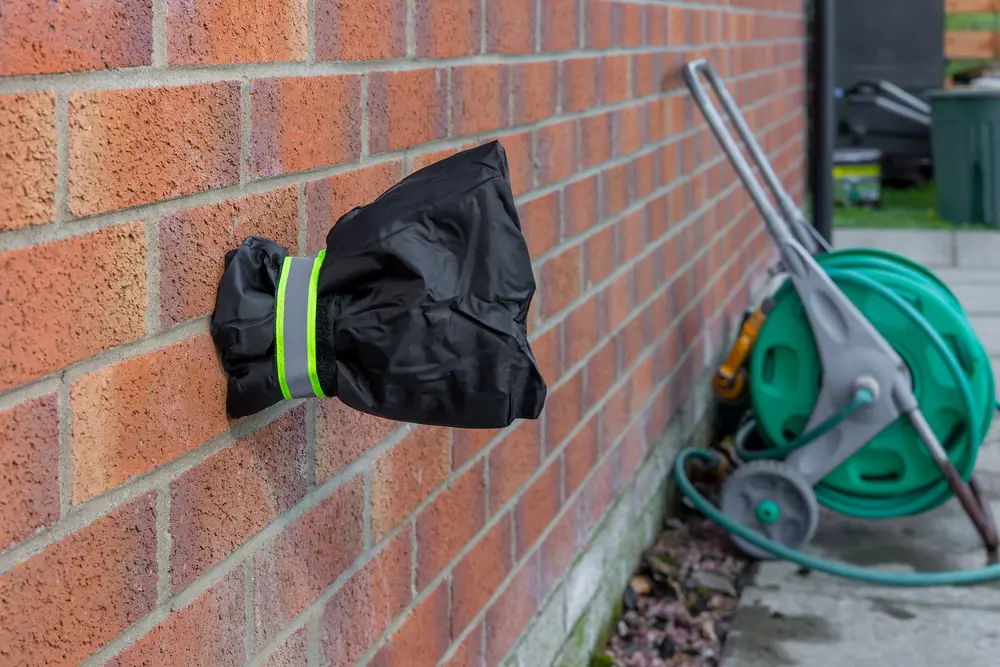 Laat de regenton in kunststof voor een kwart leeg lopen. Dat voorkomt het uitzetten van het water waardoor de kans bestaat dat de regenton scheurt. Regentonnen in hout laat je best volledig leeg. Pak daarna het kraantje in met een stuk jute of bubbelfolie.