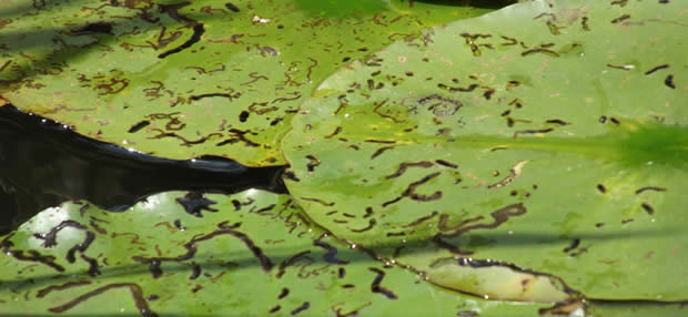 Helaas worden de blinkend groene bladeren vaak lelijk ontsiert en het ziet eruit als aangevreten sporen op de bovenkant van de bladeren van waterlelies. Het lijkt alsof er met onregelmatige vormen is gekerfd met een mes. De aangevreten sporen verkleuren bruin, waardoor het blad er triestig gaat uitzien. Daarna zal het blad afsterven en verrotten. De bloemen van waterlelies worden echter zelden aangetast, hoewel ook bloemknoppen soms ook worden aangevreten, het gevolg nadien zijn misvormde bloemen.