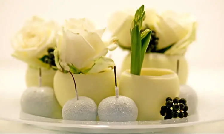 Zelfgemaakte bloempotjes gemaakt uit oude kaarsen. Maak je eigen bloempotjes met kaarsvet en vul ze met bloemen naar eigen keuze.