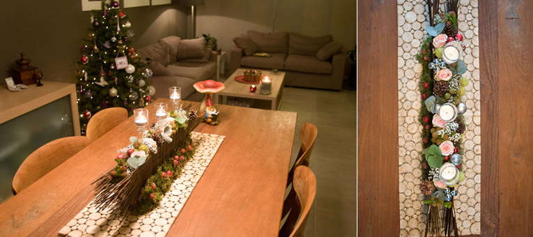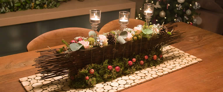- Maak een schikking van de bloemen, safarimateriaal en kerstdecoratie tussen het geweven koffieriet. Begin in het midden van de tafeldeco en werk zo aan beide zijden verder. Zorg ervoor dat het materiaal ca. 1/3 boven het koffieriet uitsteekt.