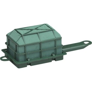 Haal het steekschuim uit de houder en dompel hem onder in een emmer met water. Laat het steekschuim volzuigen met water tot hij naar de bodem zinkt en plaats hem terug in de houder. Start onderaan de houder met het bladgroen. Zorg rondom rond voor een dichte groene laag zodat de houder onderaan niet meer zichtbaar is.