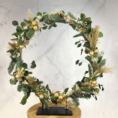 - Decoratieve cirkel op voet als je de krans op de kast of op tafel wenst te plaatsen of een decoratieve cirkel zonder voet als je hem aan de deur of aan de muur wenst op te hangen.