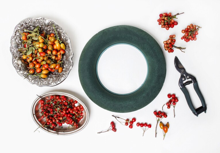 Week het oasis schuim in water door de schuimkrans in een bassin met water te plaatsen totdat het volledig verzadigd is. Laat vervolgens het overtollig water uitlekken. Maak ondertussen de bessen en rozenbottels schoon door vuil en bladresten te verwijderen.