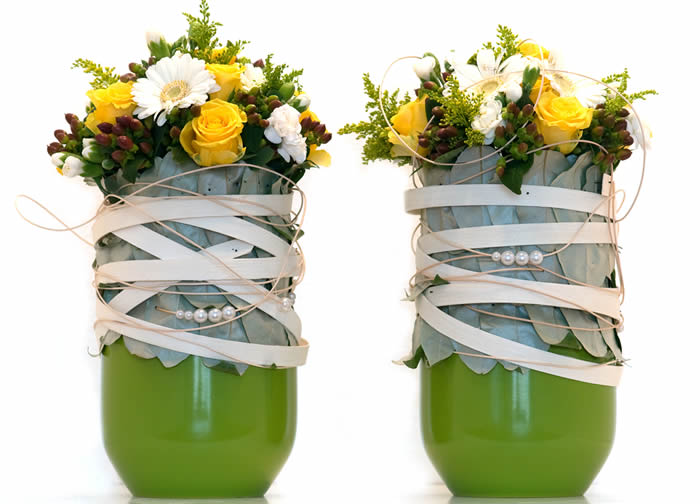 - Schuif een aantal parels, knopen of schelpen over het dunste pitriet en wikkel dit vervolgens rond de potten samen met wat breder pitriet. Steek het dunste riet vast in het steekschuim en het breder riet met etalagespelden.