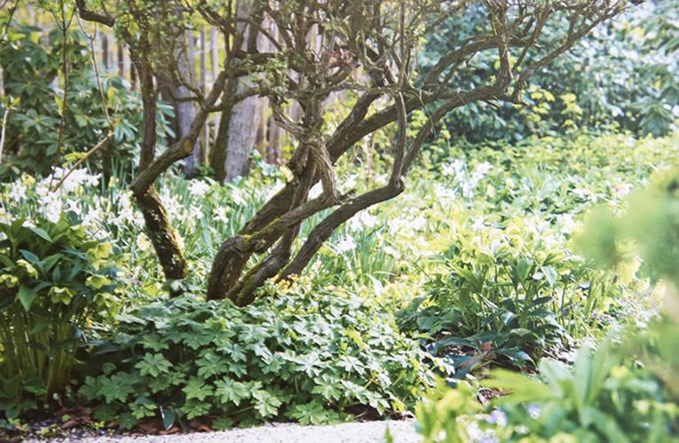 Fruitbomen zijn een verhaal apart. Op welke manier ze ook geplant zijn, verspreid over het gras, als laantje of als leibomen tegen een stenen muur, het is altijd mooi om ze een stevige voet te geven. Zo zag ik in de moestuin van Schloss Ippenburg in Bad Essen (Duitsland) appelbomen die met hun voet in grote cirkels van Geranium macrorrhizum 'Spessart' staan; cirkels van zeker 2,5 meter doorsnee die de bomen een mooie verankering in het gazon gaven. Heel statig en beeldschoon wanneer eerst de witte appelbloesem verschijn en de witte bloemen van de geranium het daarna overnemen. Maar ook de rest van het jaar het aanzien waard door het mooie geraniumblad.