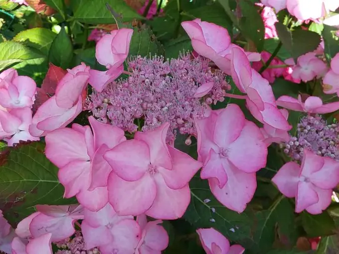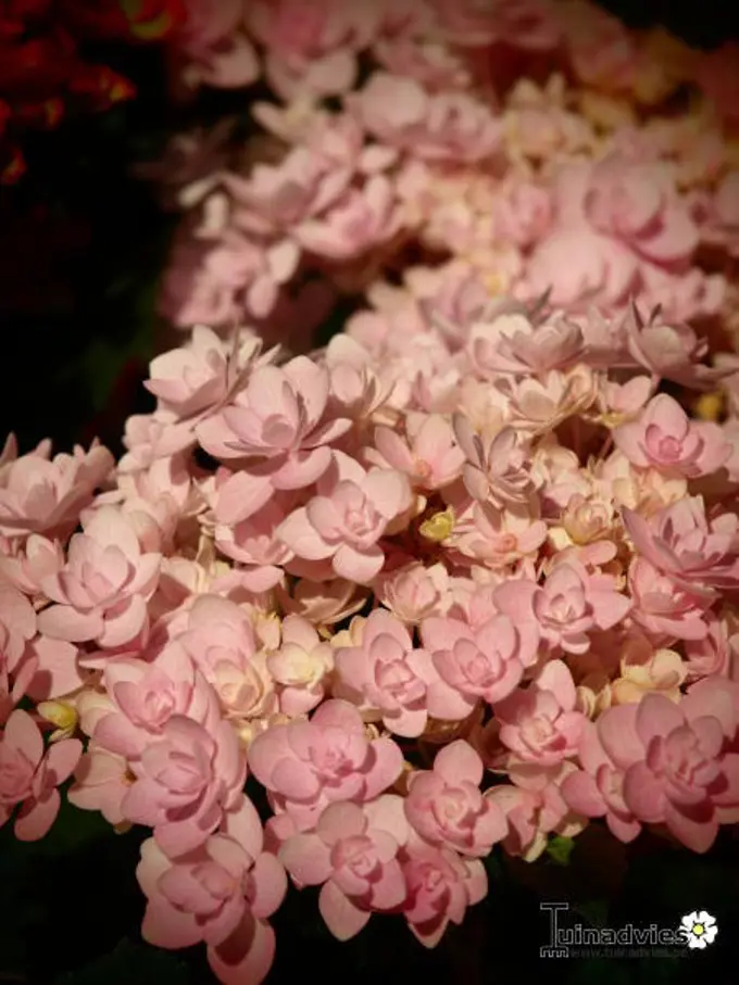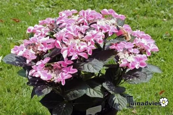 Hortensia (Saxifragaceae ofwel steenbreekachtigen). Hydrangea macrophylla (Hydran = water / Angeion = vaatje ... aan te raden meestal).
