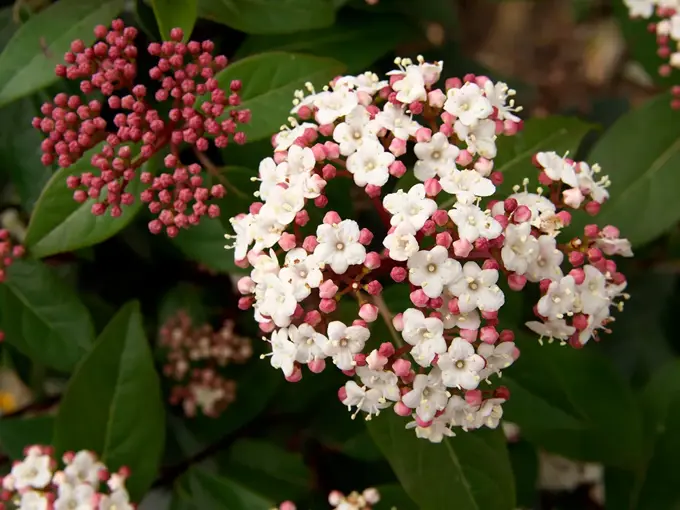 Wintergroene planten in de tuin Viburnum tinus ‘Lisa Rose’: wordt ook wel sneeuwbal genoemd